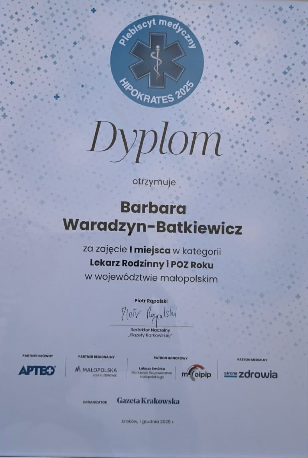 Gratulujemy zajęcia I miejsca w kategorii Lekarz Rodzinny i POZ Roku w województwie małopolskim. To wyjątkowe wyróżnienie jest potwierdzeniem Pani ogromnego profesjonalizmu, wiedzy, empatii i codziennego zaangażowania w niesienie pomocy pacjentom.